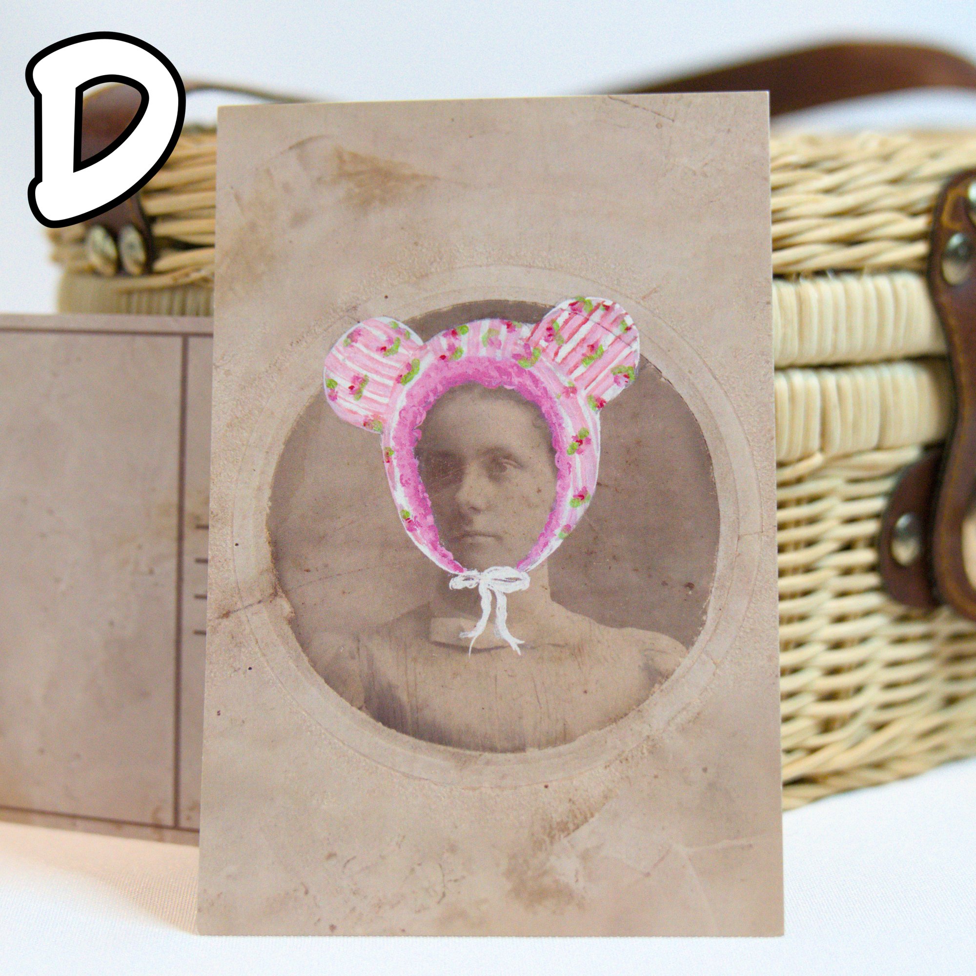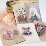 Postcards are prints of photographs with acrylic paint. Each portrait was locally sourced from antique shops, with At Mai Pace hats painted onto the original image.